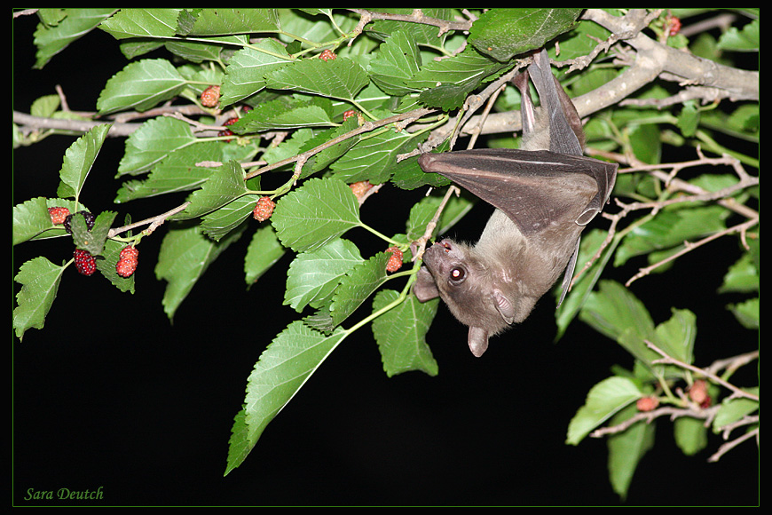 And here is a picture of the same tree at night, taken from out kitchen window. When the berries are ripe during May, we get visitors — Egyptian Fruit Bats. Photo courtesy Sara Deutch. See more photos at Jerusalem Animals.