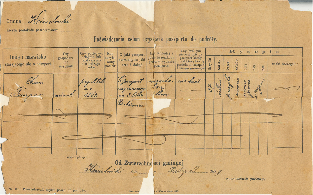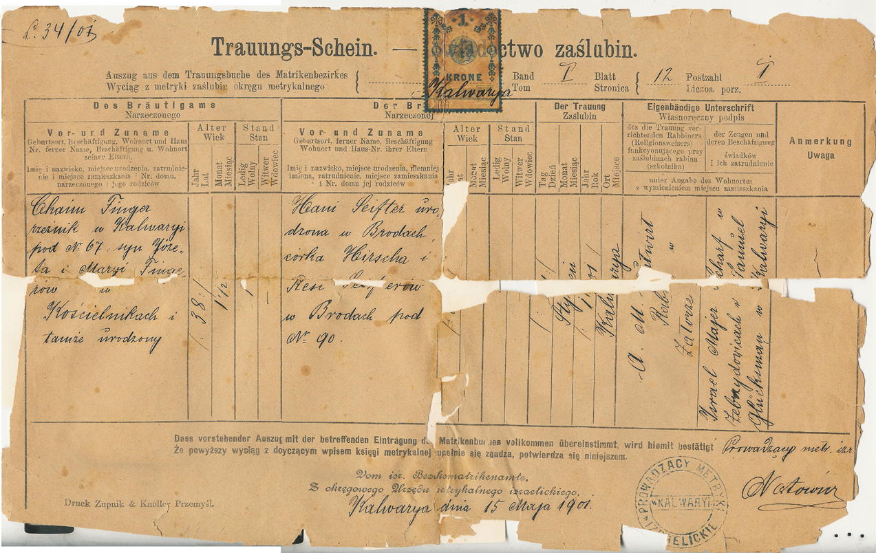 There area in which they lived was called "Galicia", part of the Austro-Hungarian Empire between 1772-1918. There is an excellent map of Galicia, showing Brody at the very eastern border, east of Lemberg, and Cracow near the Western border. Much information on Brody can be found starting at JewishGen Shtetlinks site on Brody. Kalvarya does not appear on this map, but it is about 14 km east of Wadowice, about halfway between Wadowice and Myslenice, very near Landskron. You can see it on a modern on map of Poland. Information on Kalvarya can be found via a Google Search on Kalwaria Zebrzydowska. I do not know whether Hayyim was a שוחט (ritual slaughterer) or whether he was a meat cutter. The letter below indicates that he actually slaughtered animals, but Aunt Molly said that he did not, though she might have only been referring to his life in America.
